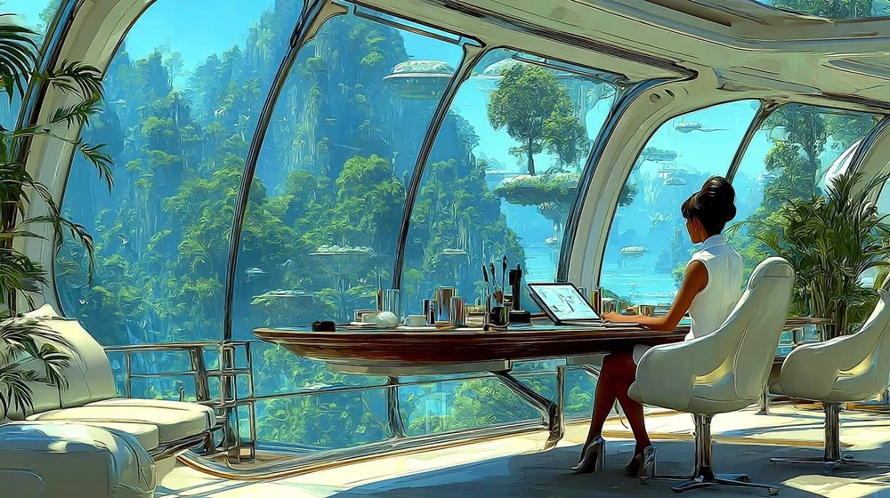 Futuristic AI-powered hotel with robot staff. Created with Midjourney.